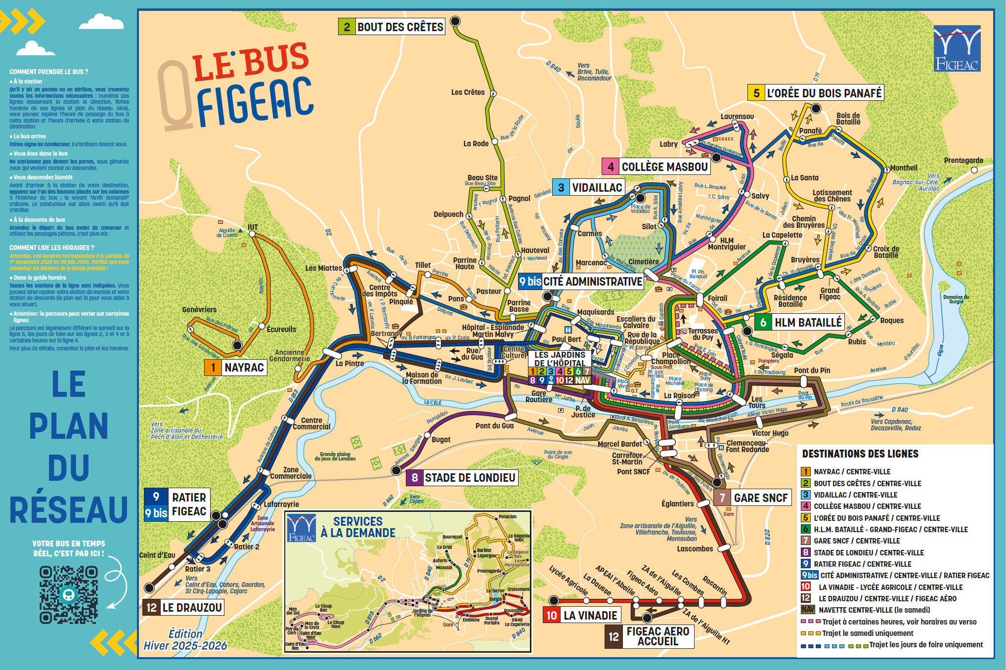 Avec 12 lignes régulières et 93 arrêts, il permet de se déplacer facilement à Figeac tout au long de l’année.